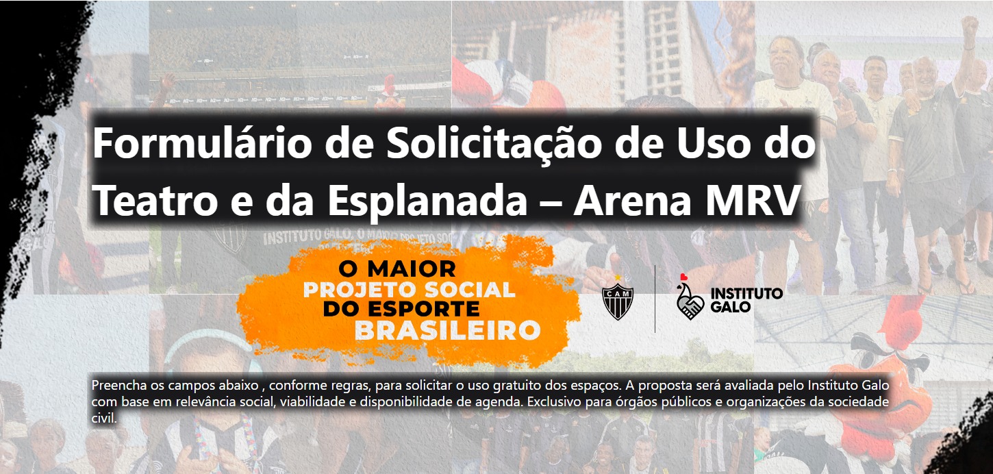 O Instituto Galo, na qualidade de braço social do Complexo Esportivo Arena MRV, torna pública a presente chamada para seleção de propostas de utilização gratuita do espaço denominado “Teatro” (Sala Coletiva de Imprensa) e esplanada para a realização de atividades culturais, sociais, educacionais ou comunitárias, órgãos públicos e organizações da sociedade civil (institucionalizadas ou não), conforme critérios estabelecidos neste edital.